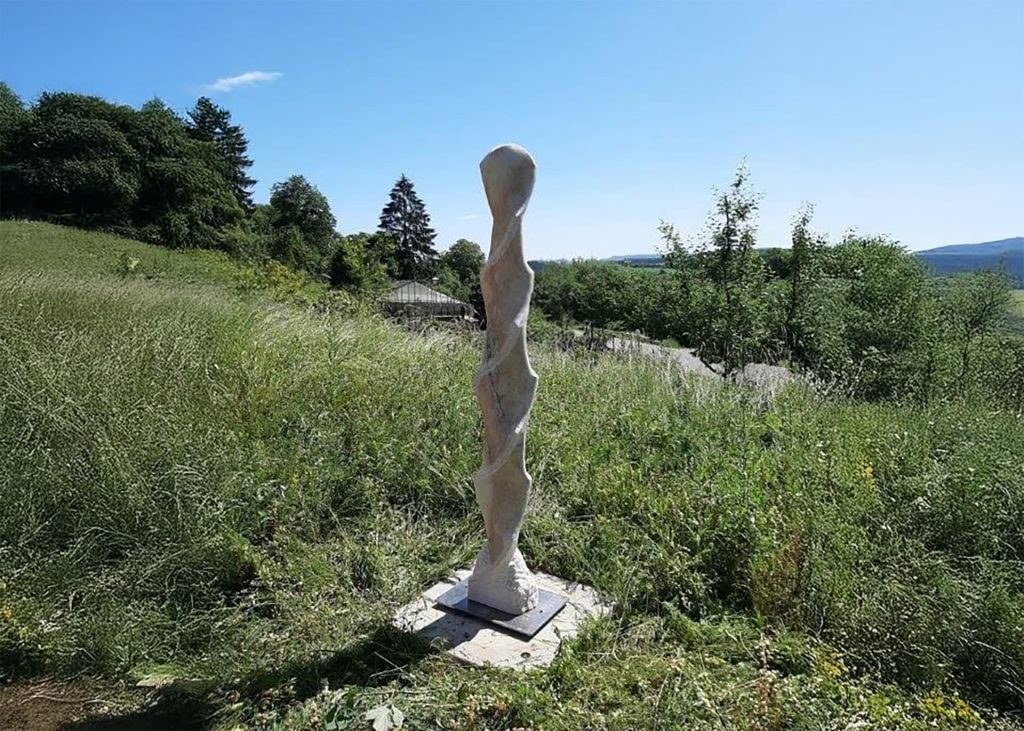 Die Skulptur FLORA entstand für eine geladene Ausstellung im Skulpturenpark in Rosenfeld „ROSENGARTEN“. Das erste Bild zeigt sie fertig aufgestellt, danach folgen die Ansichten vom Rohstein über die Ausarbeitung der Form bis zum Schliff der Oberfläche.